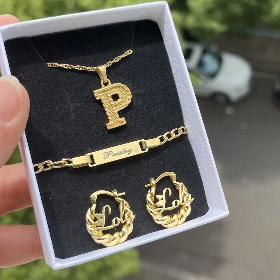 3 piece toddler set, initial necklace, I’d bracelet, and hoop earrings.